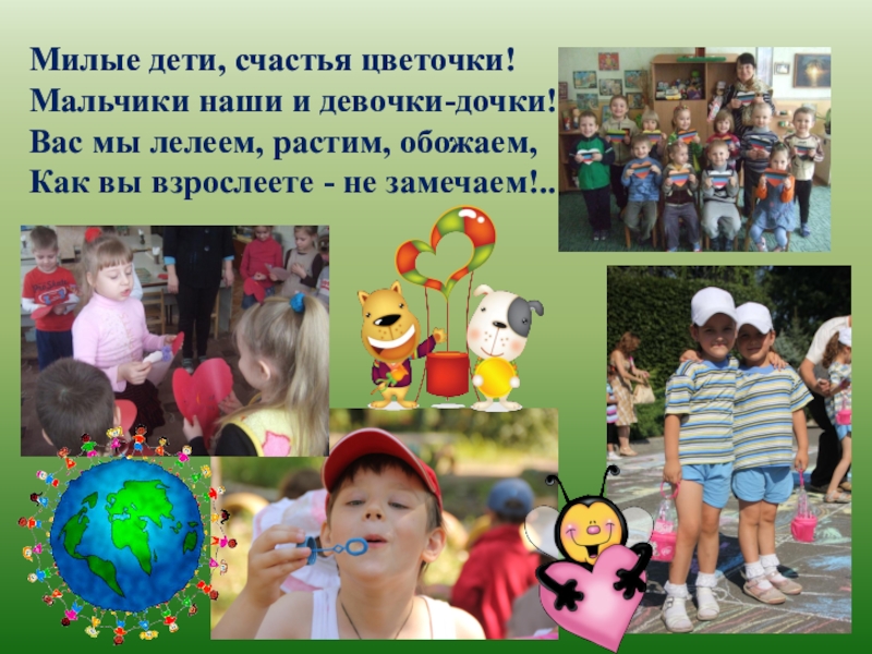 Милые дети, счастья цветочки! Мальчики наши и девочки-дочки! Вас мы лелеем, растим, обожаем, Как вы взрослеете -
