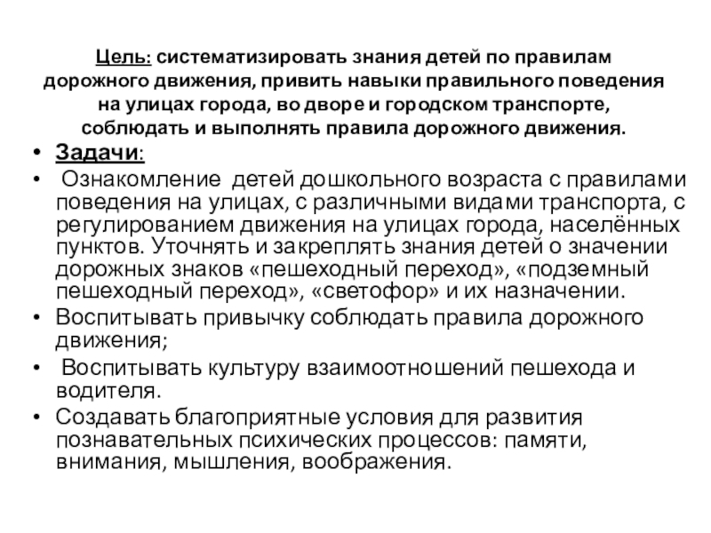 Ознакомление детей дошкольного возраста с правилами поведения на улицах, с различными видами транспорта, с регулированием движения на улицах города, населённых пунктов. Уточнять и закреплять знания детей о значении дорожных знаков «пешеходный переход», «подземный пешеходный переход», «светофор» и их назначении.