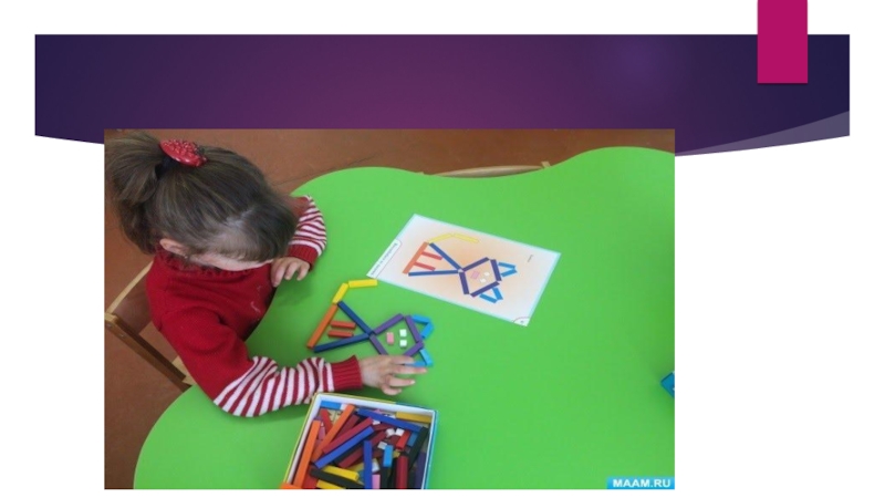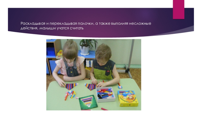 Слайд 9Раскладывая и перекладывая палочки, а также выполняя несложные действия, малыши учатся