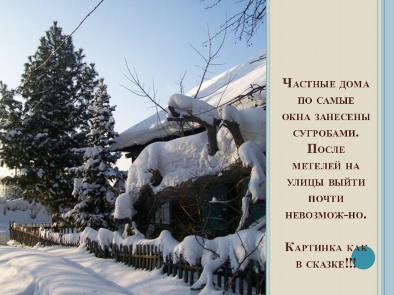 Слайд 4Частные дома по самые окна занесены сугробами. После метелей на улицы выйти