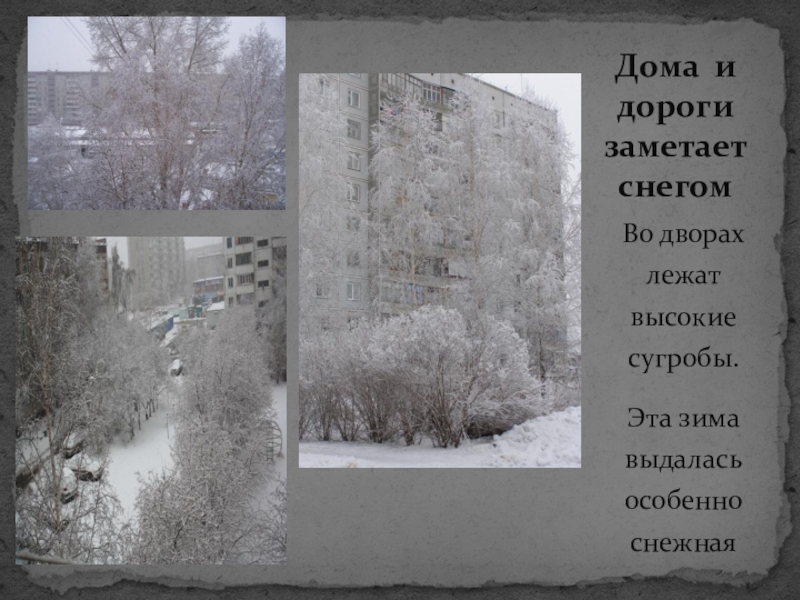 Во дворах лежат высокие сугробы.Эта зима выдалась особенно снежнаяДома и дороги заметает снегом