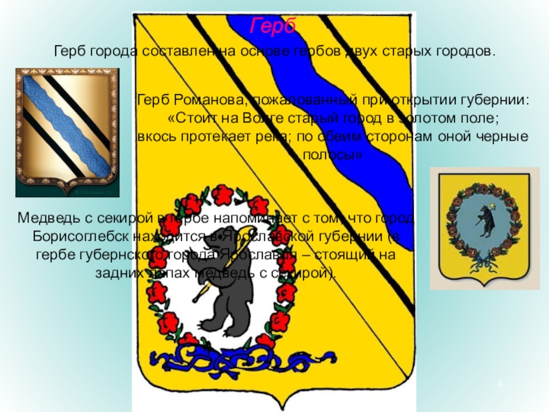 Медведь с секирой в гербе напоминает с том, что город Борисоглебск находится в Ярославской губернии (в гербе губернского города Ярославля – стоящий на задних лапах медведь с секирой).