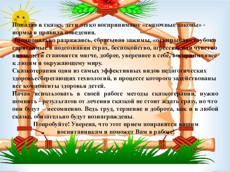 Начав использовать в своей работе методы сказкотерапии, нужно помнить - результатов от лечения сказкой не стоит ждать сразу, но что они будут – несомненно. Ведь труд, терпение и доброта, как и в любой сказке, обязательно будут вознаграждены.