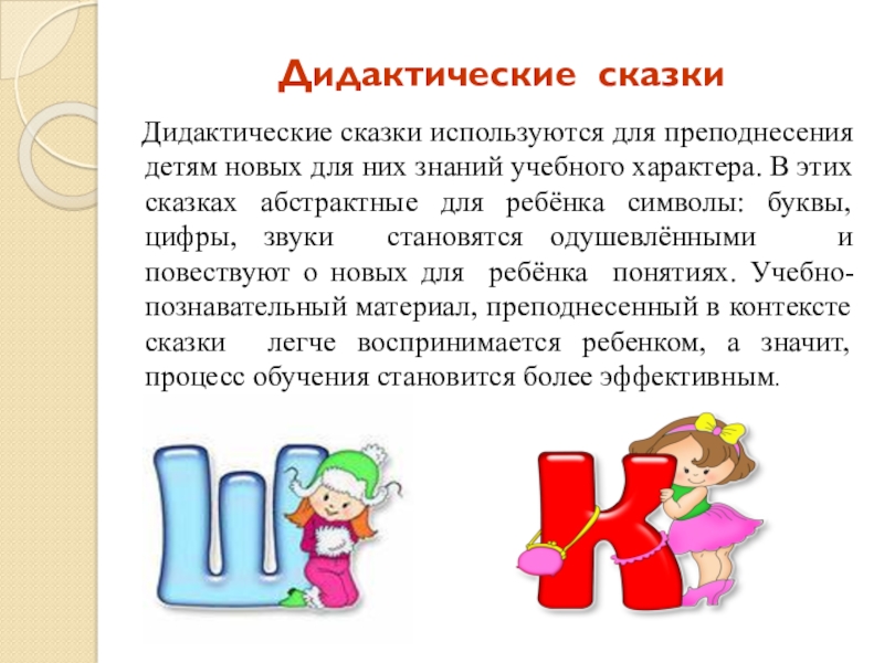 знаний учебного характера. В этих сказках абстрактные для ребёнка символы: буквы, цифры, звуки становятся одушевлёнными и повествуют о новых для ребёнка понятиях. Учебно-познавательный материал, преподнесенный в контексте сказки легче воспринимается ребенком, а значит, процесс обучения становится более эффективным.