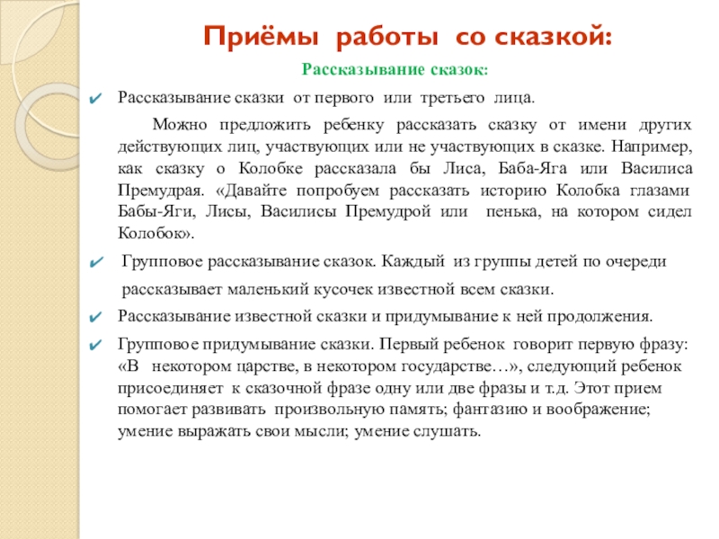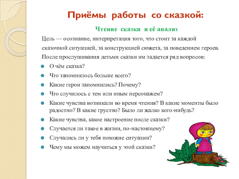 разнообразные приемы работы со сказкой (обсуждение, вопросы к детям, инсценирование