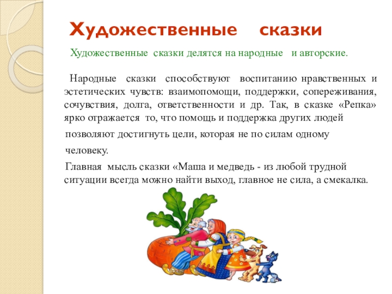 Народные сказки способствуют воспитанию нравственных и эстетических чувств: взаимопомощи, поддержки, сопереживания, сочувствия, долга, ответственности и др. Так, в сказке «Репка» ярко отражается то, что помощь и поддержка других людей