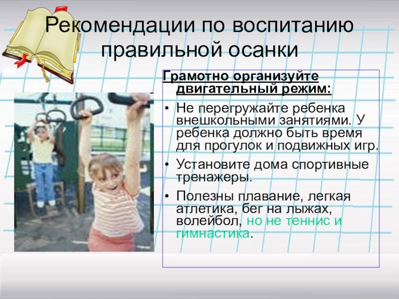 Рекомендации по воспитанию правильной осанкиГрамотно организуйте двигательный режим:Не перегружайте ребенка внешкольными занятиями. У ребенка должно быть время