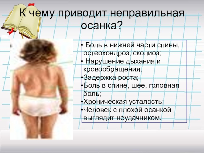 К чему приводит неправильная осанка? Боль в нижней части спины, остеохондроз, сколиоз; Нарушение дыхания и кровообращения;Задержка роста;Боль