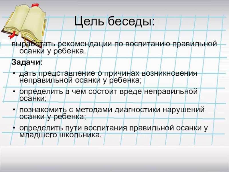 Цель беседы:выработать рекомендации по воспитанию правильной осанки у ребенка.Задачи:дать представление о причинах возникновения неправильной осанки у ребенка;определить