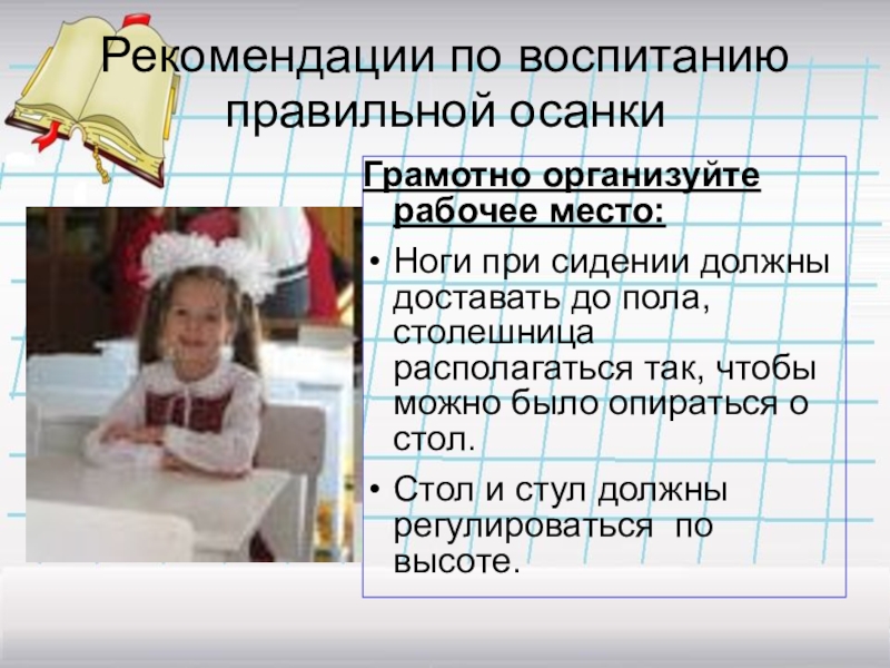 Рекомендации по воспитанию правильной осанкиГрамотно организуйте рабочее место:Ноги при сидении должны доставать до пола, столешница располагаться так,