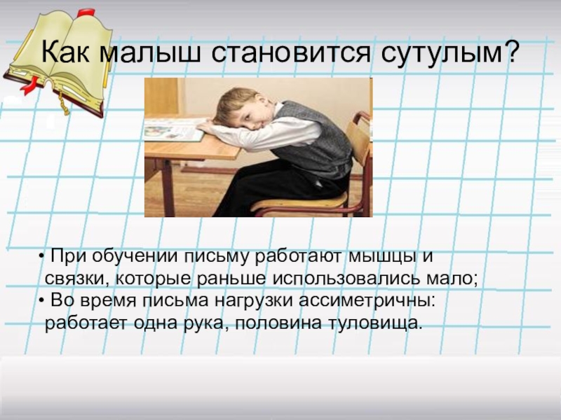 Как малыш становится сутулым? При обучении письму работают мышцы и связки, которые раньше использовались мало; Во время