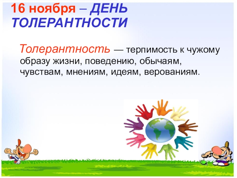 Толерантность — терпимость к чужому образу жизни, поведению, обычаям, чувствам, мнениям, идеям, верованиям.  16 ноября