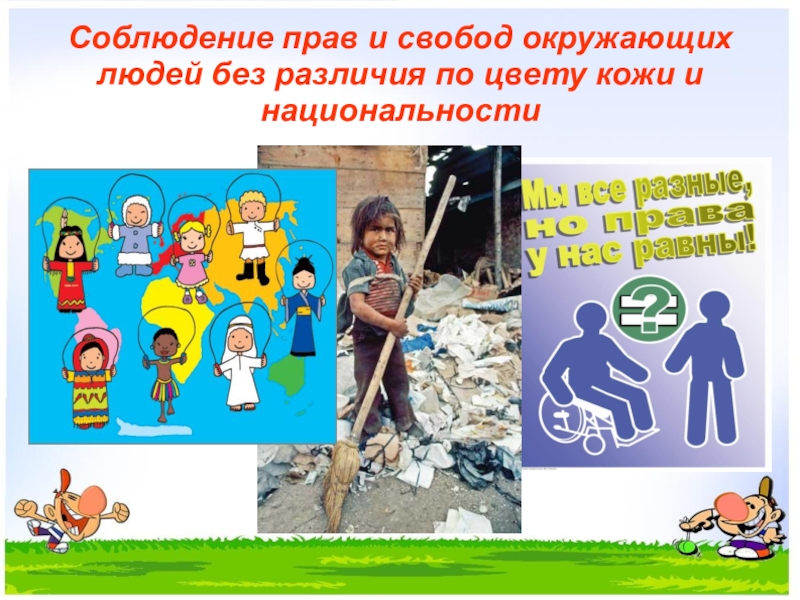 Слайд 7Соблюдение прав и свобод окружающих людей без различия по цвету кожи