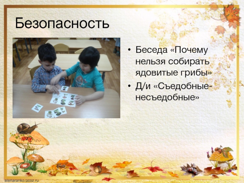 БезопасностьБеседа «Почему нельзя собирать ядовитые грибы»Д/и «Съедобные-несъедобные»