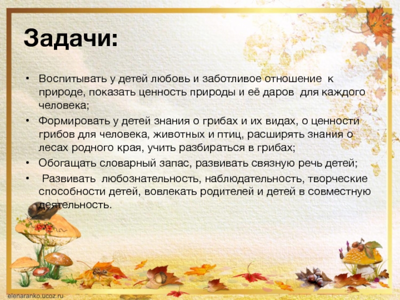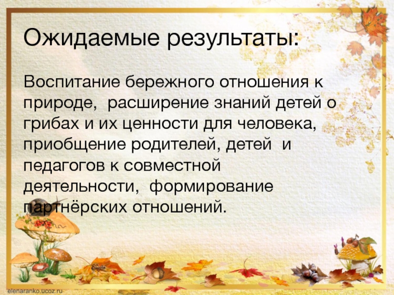 Ожидаемые результаты:Воспитание бережного отношения к природе,  расширение знаний детей о грибах и их ценности для человека, приобщение родителей,