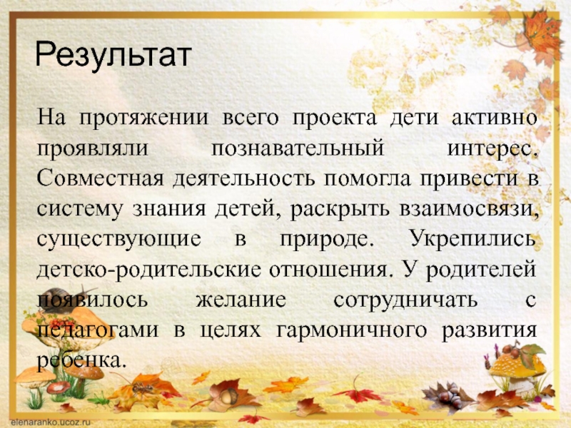 помогла привести в систему знания детей, раскрыть взаимосвязи, существующие в природе. Укрепились детско-родительские отношения. У родителей появилось желание сотрудничать с педагогами в целях гармоничного развития ребенка.