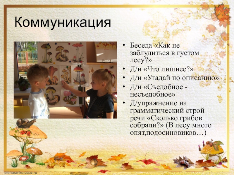 КоммуникацияБеседа «Как не заблудиться в густом лесу?»Д/и «Что лишнее?»Д/и «Угадай по описанию»Д/и «Съедобное - несъедобное»Д/упражнение на грамматический