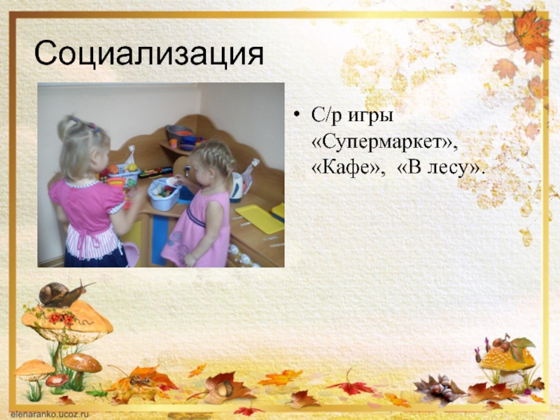 СоциализацияС/р игры «Супермаркет», «Кафе»,  «В лесу».