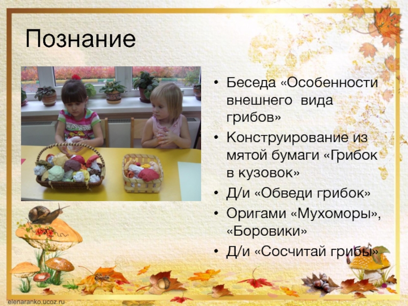 ПознаниеБеседа «Особенности внешнего  вида грибов»Конструирование из мятой бумаги «Грибок в кузовок»Д/и «Обведи грибок»Оригами «Мухоморы», «Боровики»Д/и «Сосчитай грибы»