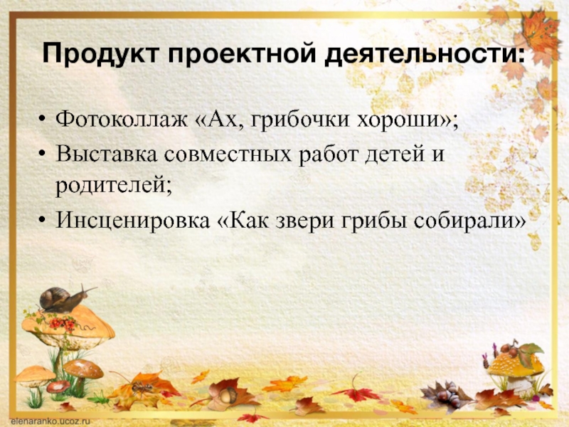 Продукт проектной деятельности:Фотоколлаж «Ах, грибочки хороши»;Выставка совместных работ детей и родителей;Инсценировка «Как звери грибы собирали»