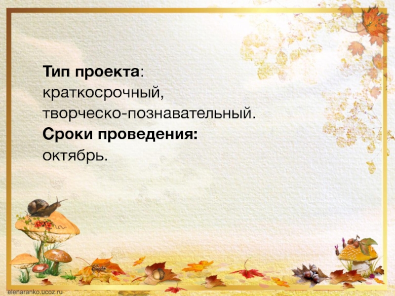 Тип проекта: краткосрочный, творческо-познавательный.Сроки проведения: октябрь.
