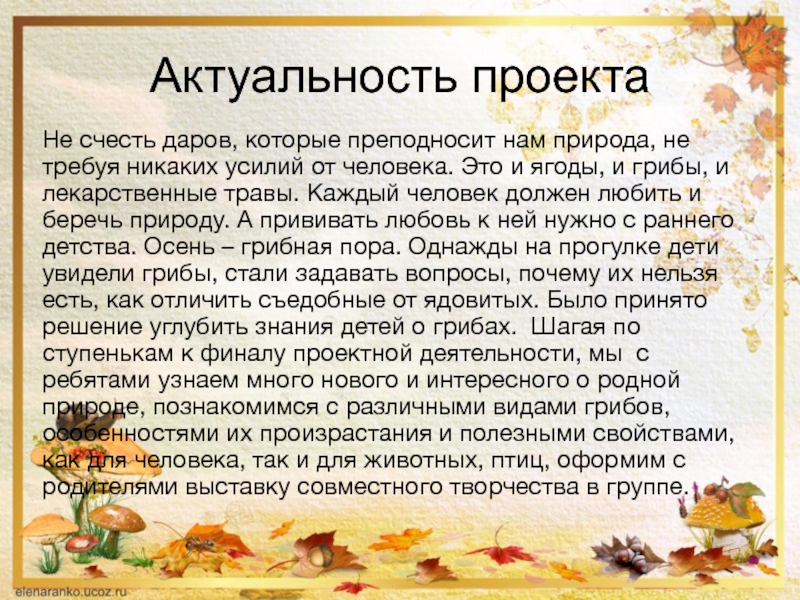 Актуальность проектаНе счесть даров, которые преподносит нам природа, не требуя никаких усилий от человека. Это и ягоды, и грибы, и лекарственные травы. Каждый человек должен любить и беречь природу. А прививать любовь к ней нужно с