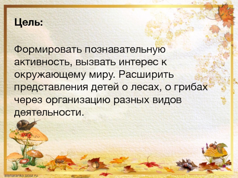 Цель:Формировать познавательную активность, вызвать интерес к окружающему миру. Расширить представления детей о лесах, о грибах через организацию