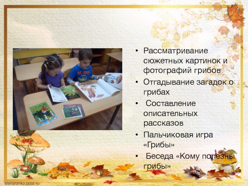 Рассматривание сюжетных картинок и фотографий грибовОтгадывание загадок о грибах Составление описательных рассказовПальчиковая игра «Грибы» Беседа «Кому полезны грибы»