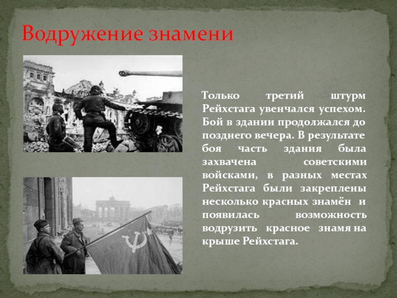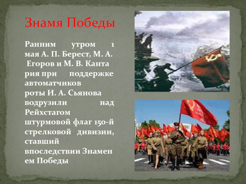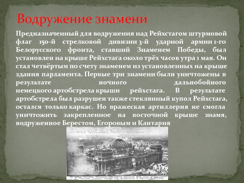 Слайд 23Ранним утром 1 мая А. П. Берест, М. А. Егоров и М. В. Кантария при поддержке автоматчиков роты И. А. Сьянова водрузили над Рейхстагом штурмовой