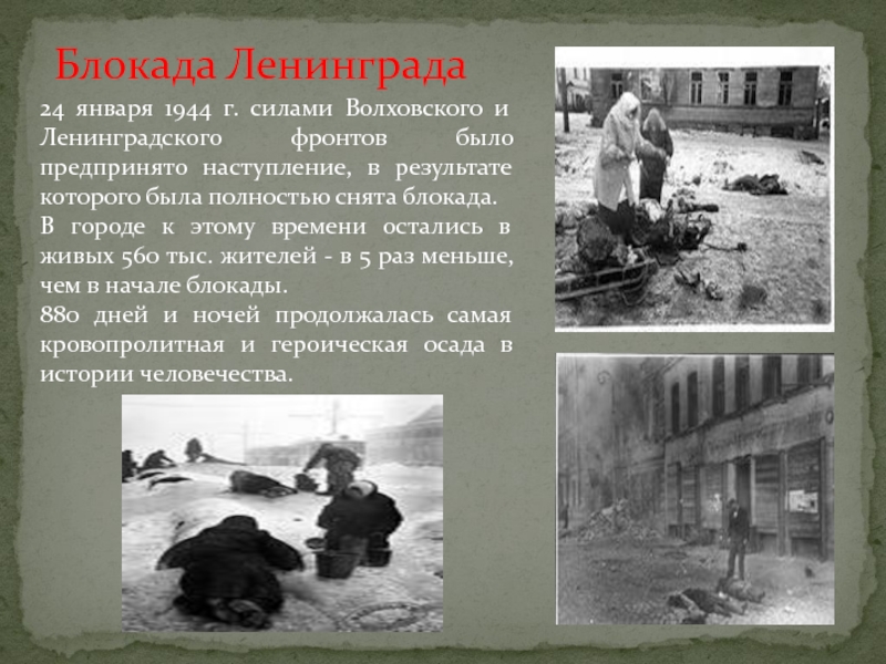 В городе к этому времени остались в живых 560 тыс. жителей - в 5 раз меньше, чем в начале блокады.