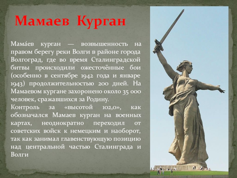 Слайд 16Мама́ев курган — возвышенность на правом берегу реки Волги в районе