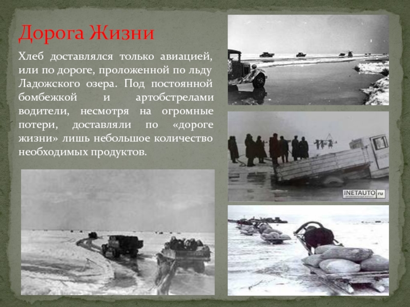 Ладожского озера. Под постоянной бомбежкой и артобстрелами водители, несмотря на огромные потери, доставляли по «дороге жизни» лишь небольшое количество необходимых продуктов.