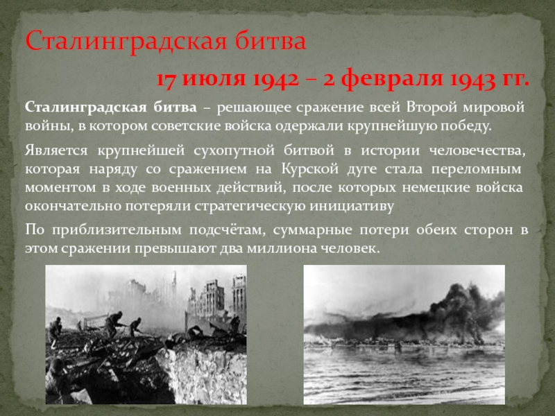 города Волгоград, где во время Сталинградской битвы происходили ожесточённые бои (особенно в сентябре 1942 года и январе 1943) продолжительностью 200 дней. На Мамаевом кургане захоронено около 35 000 человек, сражавшихся за Родину.
