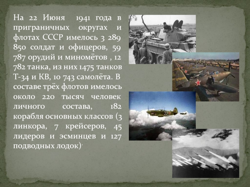 Слайд 4На 22 Июня 1941 года в приграничных округах и флотах СССР