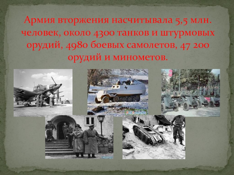 Слайд 3Армия вторжения насчитывала 5,5 млн. человек, около 4300 танков и штурмовых