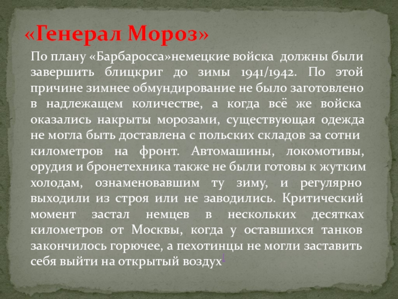 1941/1942. По этой причине зимнее обмундирование не было заготовлено в надлежащем количестве, а когда всё же войска оказались накрыты морозами, существующая одежда не могла быть доставлена с польских складов за сотни километров на фронт. Автомашины, локомотивы, орудия и бронетехника также не были готовы к жутким холодам, ознаменовавшим ту зиму, и регулярно выходили из строя или не заводились. Критический момент застал немцев в нескольких десятках километров от Москвы, когда у оставшихся танков закончилось горючее, а пехотинцы не могли заставить себя выйти на открытый воздух[