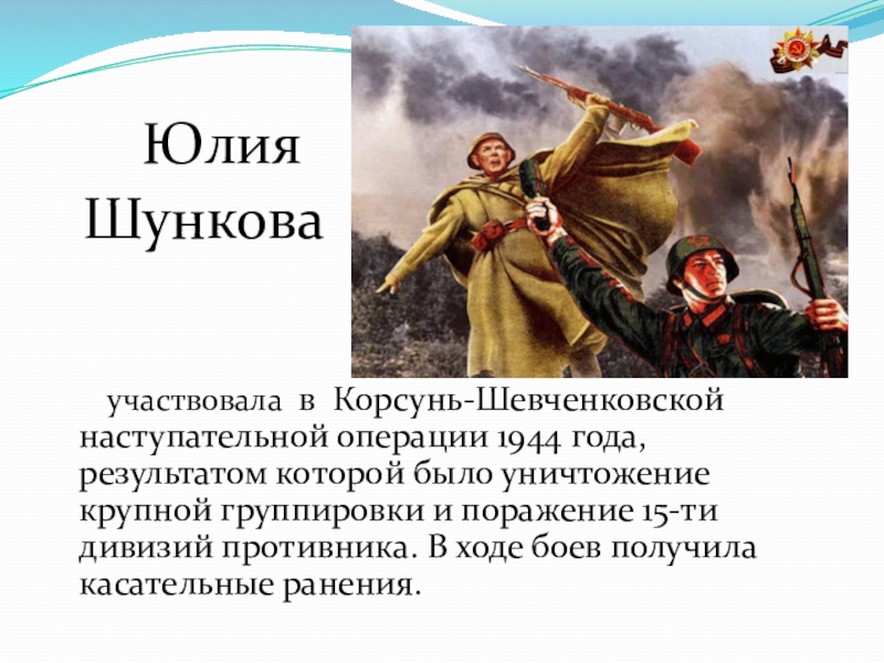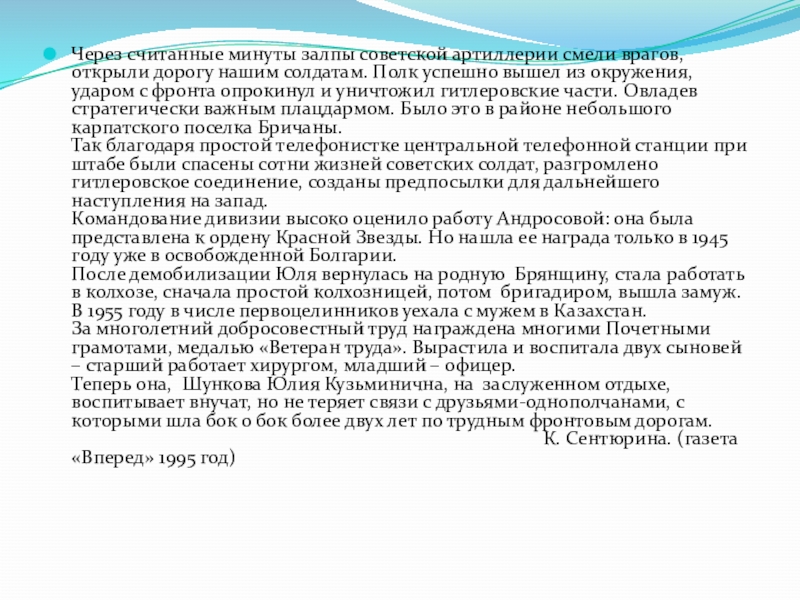 Теперь она, Шункова Юлия Кузьминична, на заслуженном отдыхе, воспитывает внучат, но не теряет связи с друзьями-однополчанами, с которыми шла бок о бок более двух лет по трудным фронтовым дорогам.