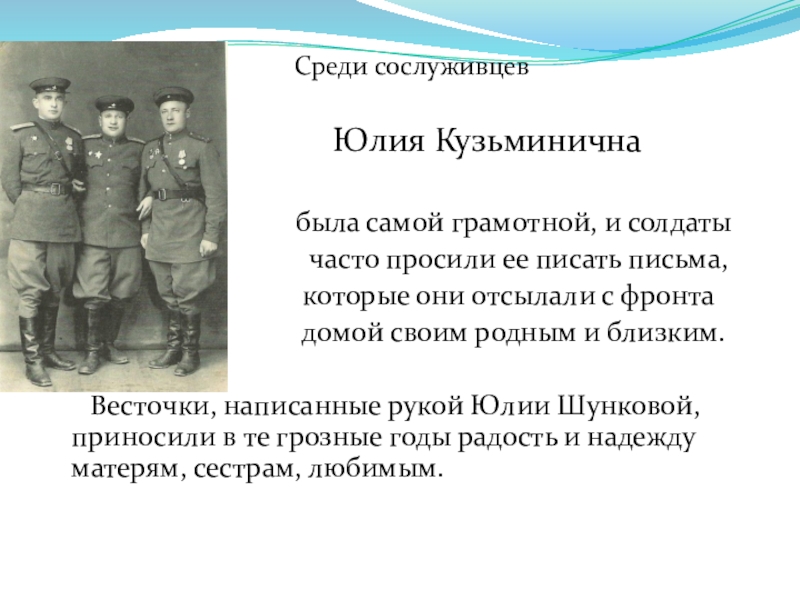 Весточки, написанные рукой Юлии Шунковой, приносили в те грозные годы радость и надежду матерям, сестрам, любимым.