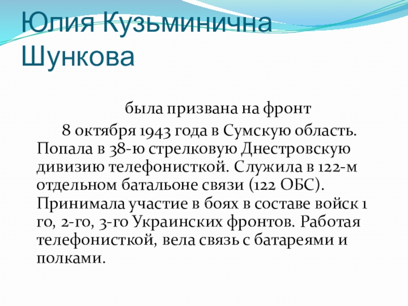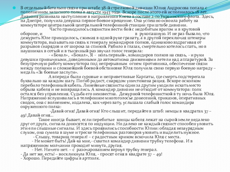 Слайд 5В отдельный батальон связи при штабе 38-й стрелковой дивизии Юлия Андросова