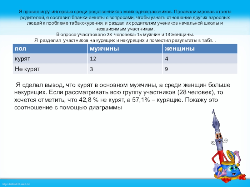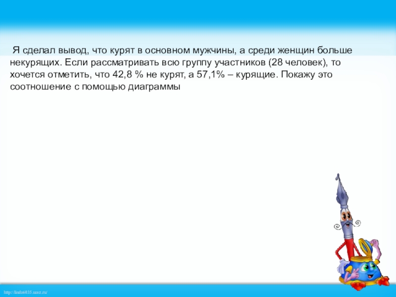 Я сделал вывод, что курят в основном мужчины, а среди женщин больше некурящих. Если рассматривать всю группу участников (28 человек), то хочется отметить, что 42,8 % не курят, а 57,1% – курящие. Покажу это соотношение с помощью диаграммы