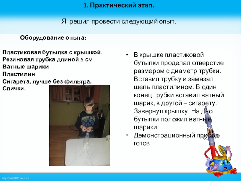 В крышке пластиковой бутылки проделал отверстие размером с диаметр трубки. Вставил трубку и замазал щель пластилином. В один конец трубки вставил ватный шарик, в другой – сигарету. Завернул крышку. На дно бутылки положил ватные шарики.
