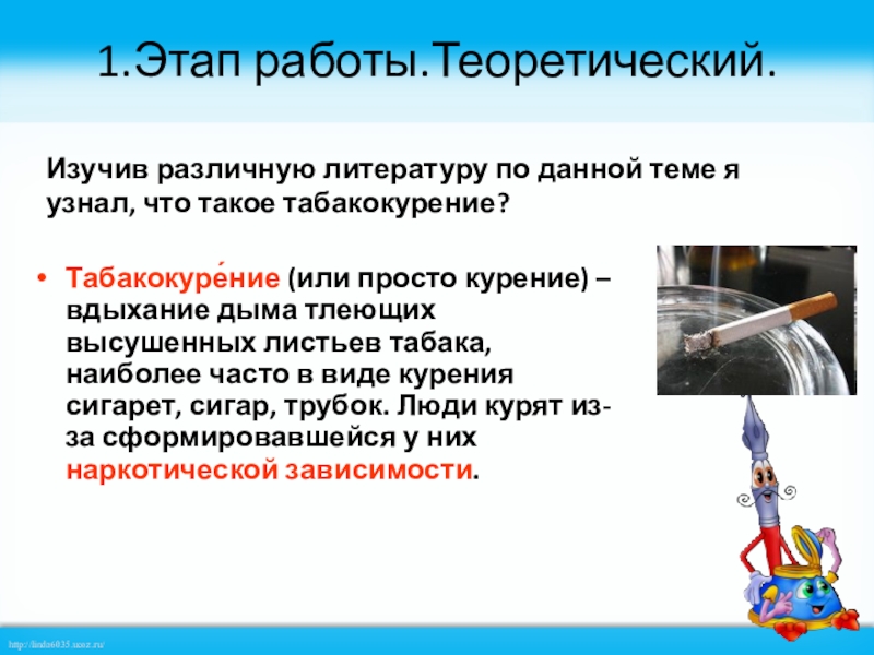 Табакокуре́ние (или просто курение) – вдыхание дыма тлеющих высушенных листьев табака, наиболее часто в виде курения сигарет, сигар, трубок. Люди курят из-за сформировавшейся у них наркотической зависимости.