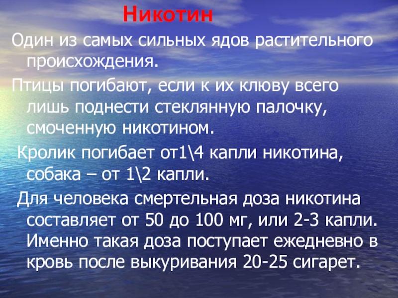 Птицы погибают, если к их клюву всего лишь поднести стеклянную палочку, смоченную никотином.