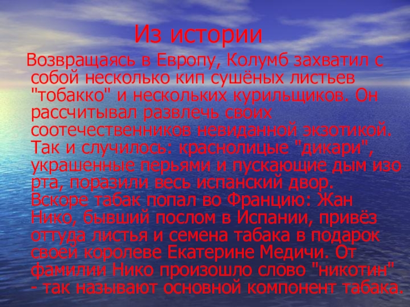 Вскоре табак попал во Францию: Жан Нико, бывший послом в Испании, привёз оттуда листья и семена табака в подарок своей королеве Екатерине Медичи. От фамилии Нико произошло слово "никотин" - так называют основной компонент табака.