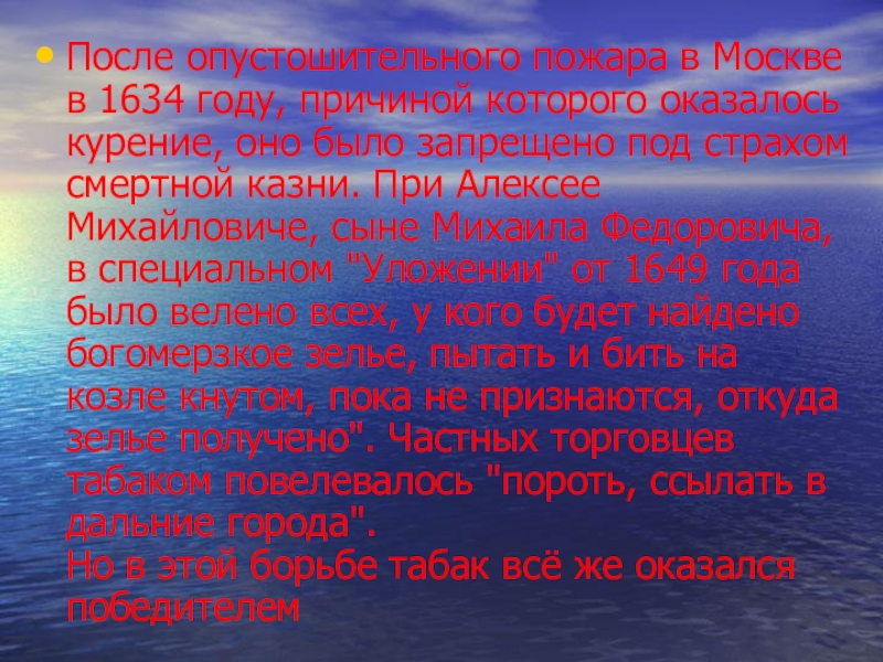 курение, оно было запрещено под страхом смертной казни. При Алексее Михайловиче, сыне Михаила Федоровича, в специальном "Уложении" от 1649 года было велено всех, у кого будет найдено богомерзкое зелье, пытать и бить на козле кнутом, пока не признаются, откуда зелье получено". Частных торговцев табаком повелевалось "пороть, ссылать в дальние города".