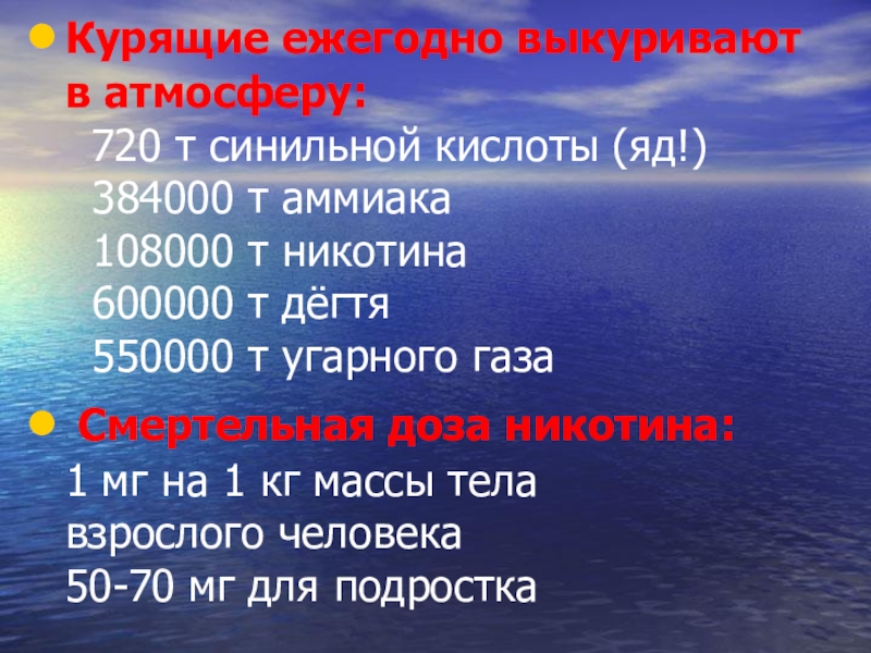 Слайд 5Курящие ежегодно выкуривают в атмосферу: