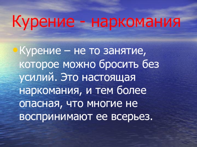 Слайд 4Курение – не то занятие, которое можно бросить без усилий. Это