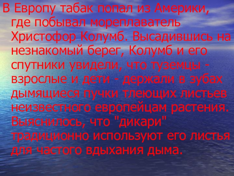 Высадившись на незнакомый берег, Колумб и его спутники увидели, что туземцы - взрослые и дети - держали в зубах дымящиеся пучки тлеющих листьев неизвестного европейцам растения. Выяснилось, что "дикари" традиционно используют его листья для частого вдыхания дыма.
