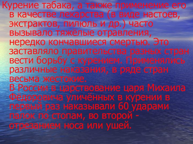 настоев, экстрактов, пилюль и др.) часто вызывало тяжёлые отравления, нередко кончавшиеся смертью. Это заставляло правительства разных стран вести борьбу с курением. Применялись различные наказания, в ряде стран весьма жестокие.