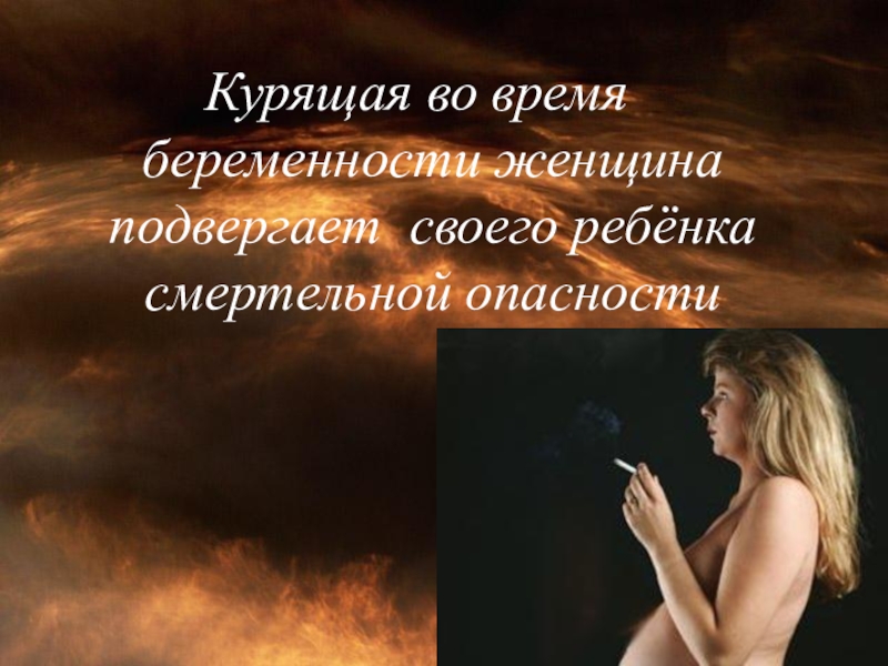 Слайд 14Курящая во время беременности женщина подвергает своего ребёнка смертельной опасности